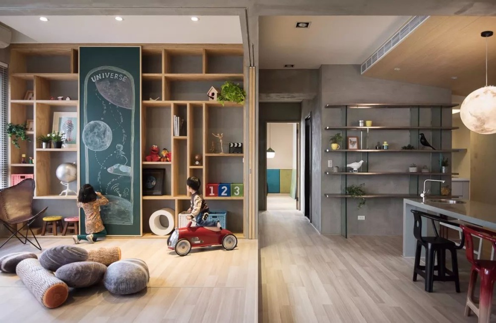 Những đứa trẻ rất yêu không gian sống của chính mình, bởi ở đó không có quá nhiều đồ đạc, sự tinh tế được bắt nguồn từ những điều giản dị nhất. Màu của gỗ tự nhiên và màu của bê tông được chọn làm gam màu chính. Không gian căn hộ ngập tràn ánh sáng, nhường phần lớn diện tích mặt sàn tạo nơi vui chơi cho trẻ nhỏ, thế là đủ cho một cuộc sống thuận lợi và bình yên, giúp các bạn nhỏ dễ dàng phát triển tối đa thể chất và trí tuệ ngay trong chính ngôi nhà của mình.