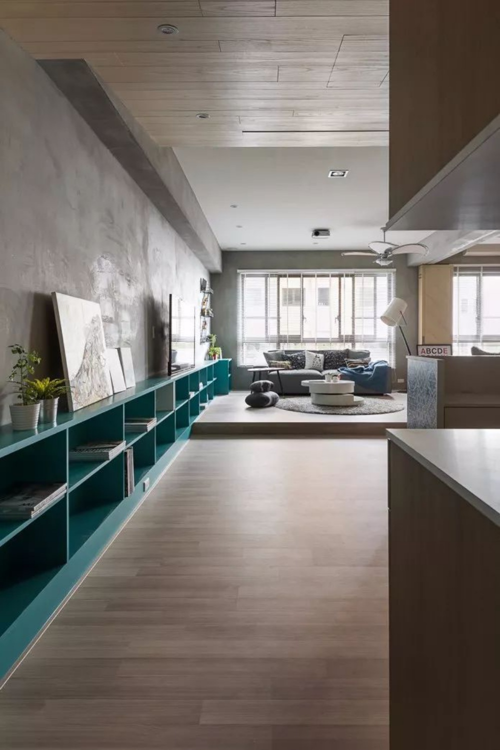 Khoảng không gian chính của căn hộ được thiết kế kệ đựng đồ với nhiều ngăn kệ gỗ với kích thước đa dạng như cách tăng thêm sức hút và điểm nhấn cho ngôi nhà.