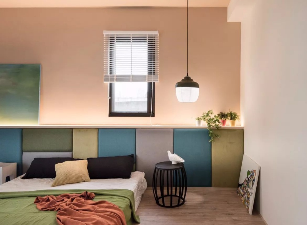 Phòng ngủ của hai con được bố trí khá ấn tượng với những gam màu tự nhiên, màu xanh xám, xanh da trời, màu vàng được kết hợp hài hòa, tăng thêm điểm nhấn cho căn phòng. Nệm được đặt ngay bên cạnh cửa sổ để các bé thoải mái chơi vui, đùa nghịch ngay trong phòng của mình.
