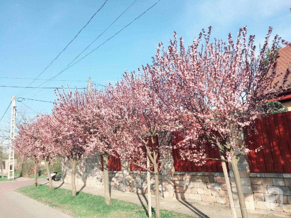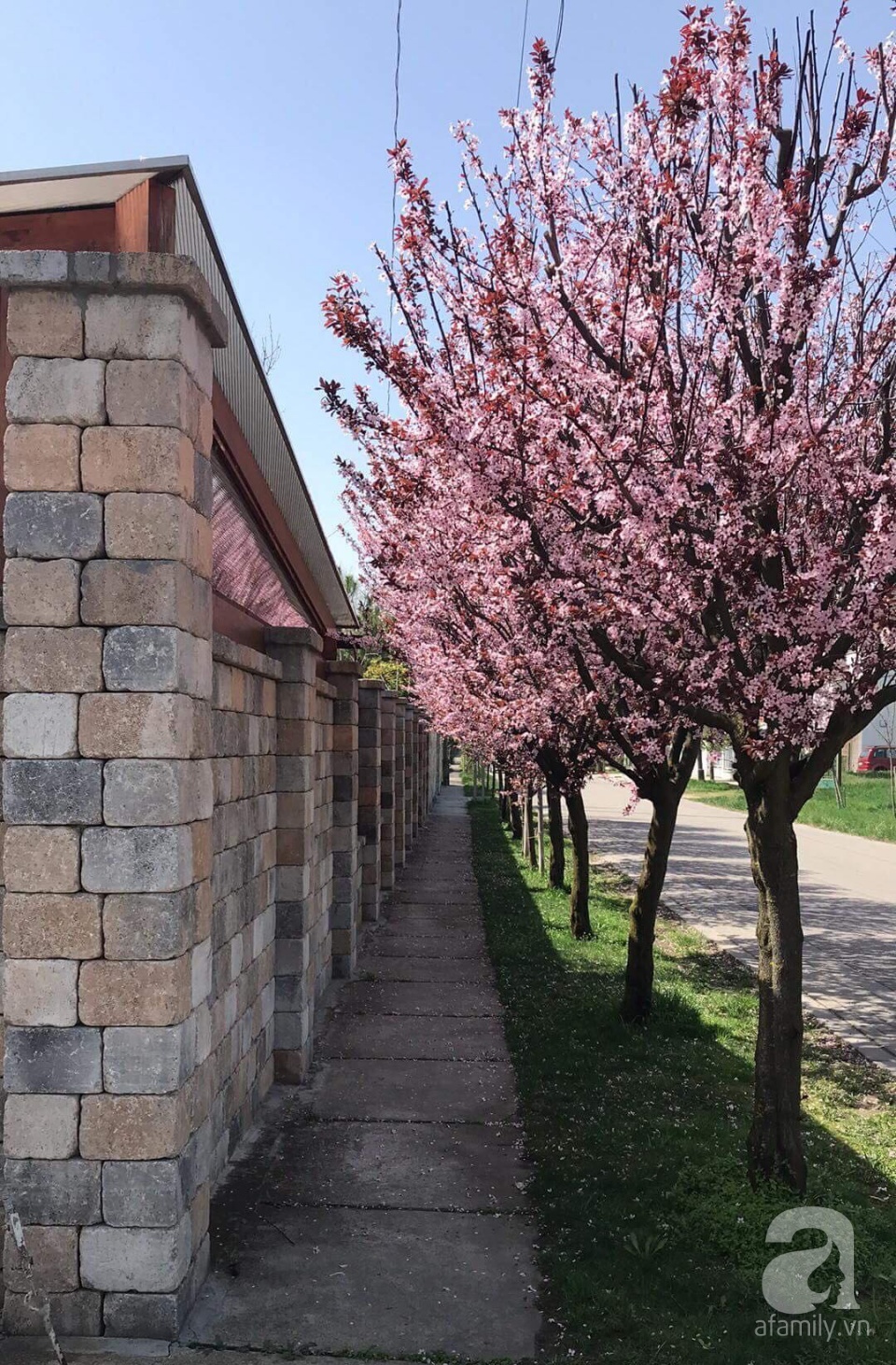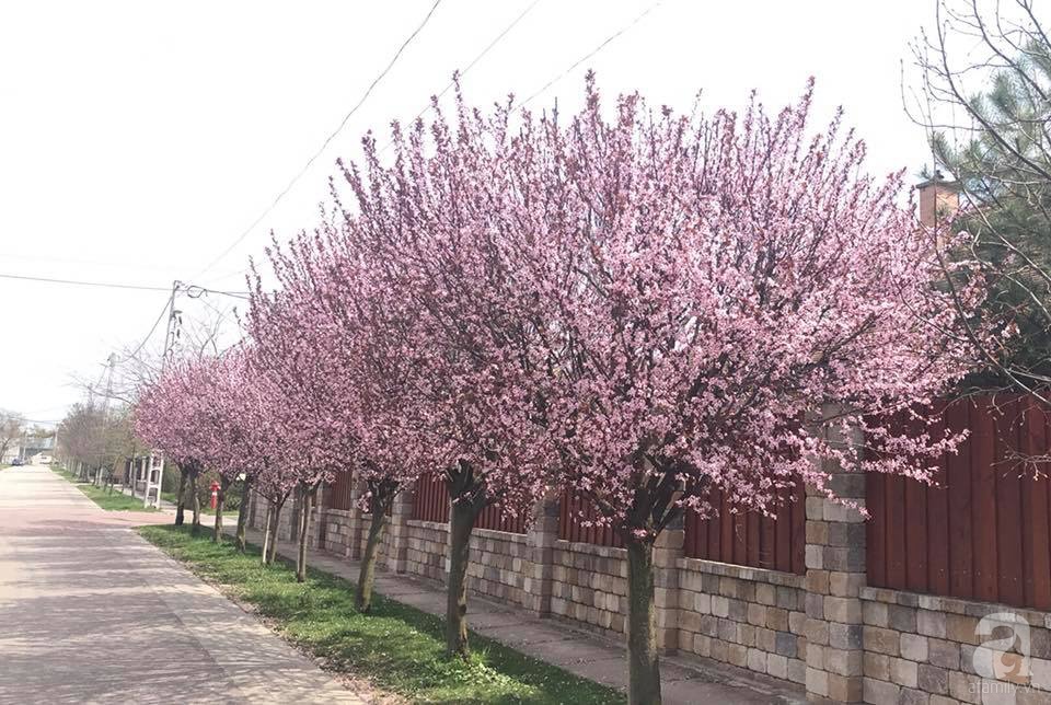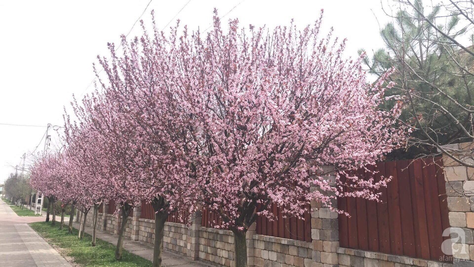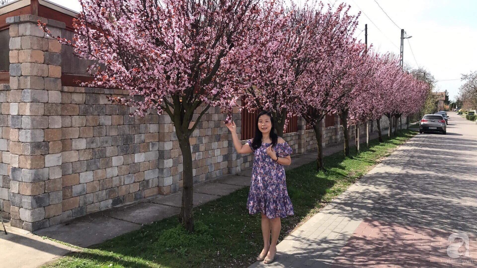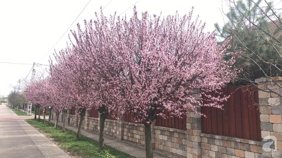 Hàng cây anh đào được chị Phương Thảo trồng đã 9 năm đang kỳ nở rộ, nhuộm hồng lối đi về mỗi ngày của các thành viên trong gia đình chị.